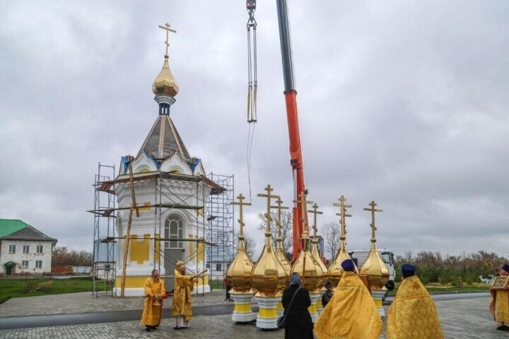 В Знаменском округе совершён важный этап в возрождении Сухотинского монастыря — на новую водосвятную часовню установили освящённые купола и кресты.