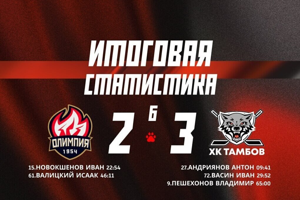 Игра началась с уверенного преимущества гостей. Уже на 9-й минуте матча Антон Адриянов открыл счёт, отправив первую шайбу в ворота хозяев. Во втором периоде «Олимпия» сумела сравнять счёт, но тамбовчане практически мгновенно вернули себе лидерство на 29-й минуте Иван Васин обеспечил счёт 2:1.